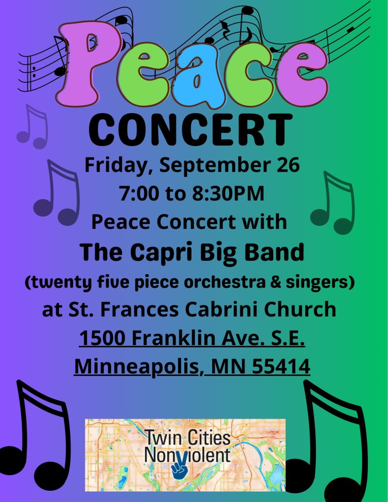 Friday, Sept. 26, 7-8:30 PM: Peace Concert, The Capri Big Band performance at St. Frances Cabrini Catholic Church, 1500 Franklin Ave SE, Minneapolis. For more info. call Jim ten Bensel 612-802-1410.