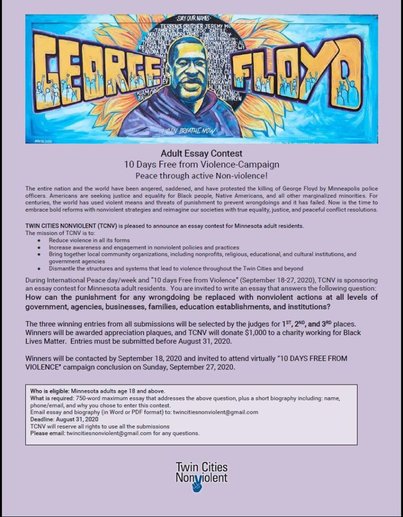 During International Peace day/week and “10 days Free from Violence” (September 18-27, 2020), TCNV is sponsoring an essay contest for Minnesota adult residents. You are invited to write an essay that answers the following question: