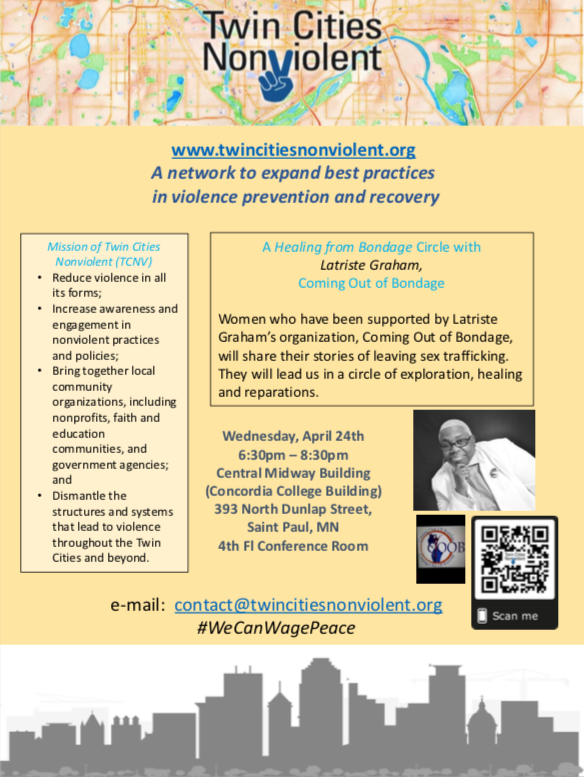 For our April 24th collaborator’s meeting, Latriste Graham will lead us in a circle of exploration, healing and reparations as a sample of their upcoming event during 10-days Free From Violence. Their organization, Coming Out of Bondage, aids sex-workers in leaving the life. See flyer below for details.